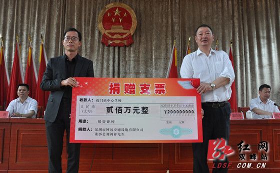 4月4日,当刘剑祥先生向花门四中捐赠200万元支票时,全场掌声雷动。当日,双峰县花门镇举行的“深圳博远公司刘剑祥董事长捐资建校”仪式上,县委常委、县人武部政委陈家齐,县人大常委会副主任李勤,县人民政府副县长李兴魁和相关部门及乡镇负责人参加仪式。