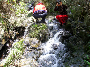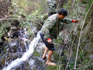 滴水峡谷深壑幽,灌木丛生,遮天蔽日。人在里面行进,非得手足并用,五体投地。有时过一块尖形大溪石,人在上面不能立足,只能如体操中的跳马一样,双手支撑着身子换来换去,好不容易找到平衡点着力点过了去。大家互相帮助,拉扯提携。