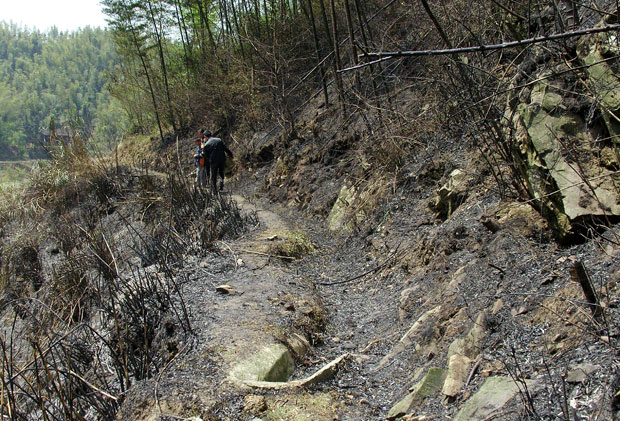 滴水峡口碰上滴水村罗支书和一山民正在烧荒。里把路长的一坡梯田被烧得精光,犹见残火余烬。我们请罗支书带路,那山民自告奋勇跟去开路。