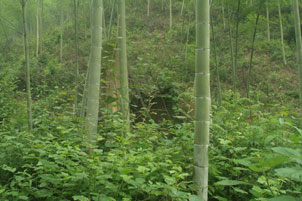 很快到得山脚。时还早,又寻冲入。来到桃林大冲。在冲口人家订了餐,进冲。冲口,一口小小山塘,雨后水色微浑,万绿融映,呈浅色鹅碧。形肖野葡萄滕状的乌泡刺茂茂密密铺陈铺排。冲颈,灌木极繁茂,颜色深绿,是初夏的原色。再上去是一条山洪冲涮而成的小小山涧,涧水时隐时现,发出动听声音。幽篁万竿,郁翠逼人。山腰,涧水断了,但见一汪清泉从一眼小洞汩汩流出。以良说,这是源头水,最没受污染,便大口捧喝。一忽,就听到他在怪叫,水里怎么有好大一泡鸟屎。