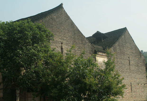 水泥路上走,人最无聊乏味。太阳高照,日正当午,都蔫蔫的。一辆当地班车恰好开来,徒步老队员都有想上车的了。上到盘山路高顶,天狮村村部和萧氏家祠在望。听到脚下远远传来哗哗水声,看到道左一排三五人合抱大树,感到阵阵沁凉舒爽。探看水声源处,是天狮村上首流来的一条山涧跌泻山谷,形成落差数十丈瀑练发出。大树保持得这么好,我疑心是萧氏家祠的风水树,靠了信仰的力量保留下来的。天狮村,典型的聚族而居。一村六百多人,基本姓肖。
