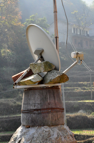 两旁的民居随山势而建,一些老人在屋外晒太阳,一些妇女在晒红薯干,红薯粉,鸡也在晒太阳。快到午饭时分,我们走进一家民居,这户民居的居住地也就是风水不错,后面靠山,山上的泉水直接流入石缸。前面地坪宽,视野好,还有一个小水池。门牌上写“东山村”,我们在大娘手里订了餐。